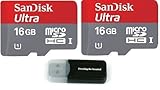 Sandisk Ultra micro SDHC Micro SD UHS-1 TF Memory Card 16GB 16G (Two Pack 16GB x2 =32GB) Class 10 w/ (1) Micro SD to Sd Adapter & Everything But Stromboli Memory Card Reader
